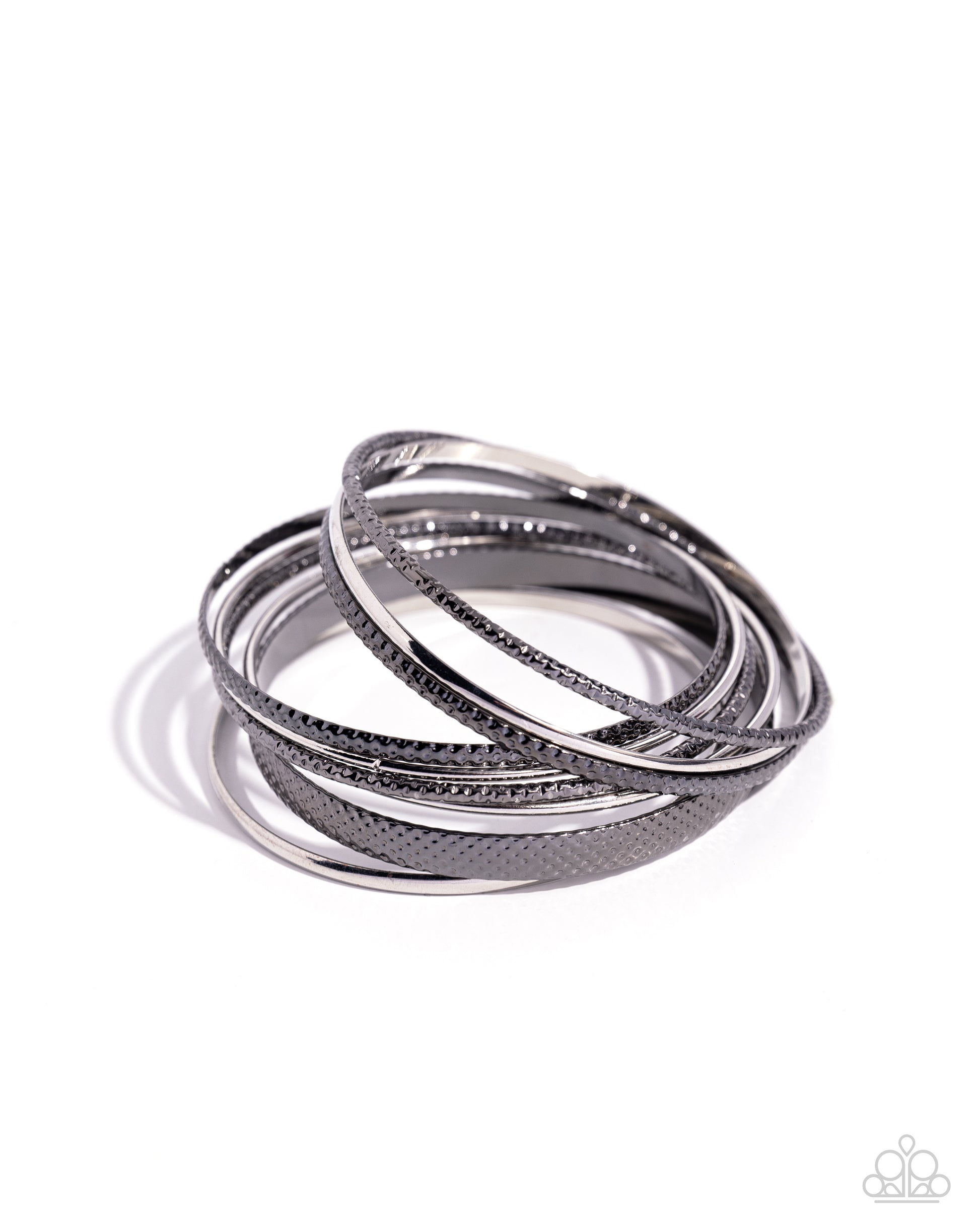 A collection of smooth and textured bangles gives off a sassy chiming melody and makes a dramatic impact as the bright, shimmering silver and gunmetal surfaces stack up the wrist.