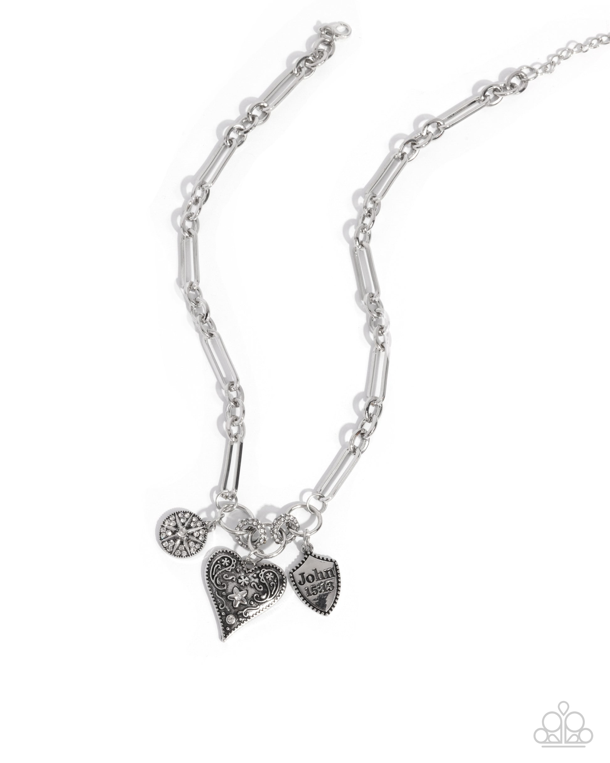 Featuring whimsical filigree detailing, a silver heart joins a white rhinestone-embellished compass-inspired charm, and a studded shield with the words "John 15:13" that alternate with white rhinestone-dusted discs below the neckline from a silver figaro chain for an iconic, inspirational design. Features an adjustable clasp closure.